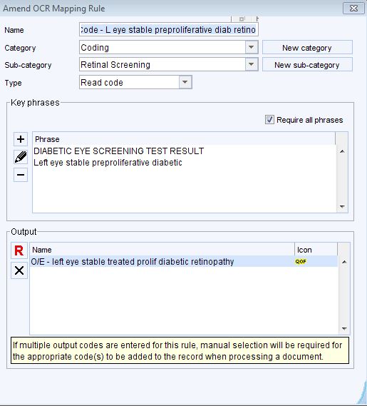 In this example the scanning rule is looking for any of the key phrases and because there are three read codes listed the person who is scanning will be prompted to select which ever code is most appropriate.