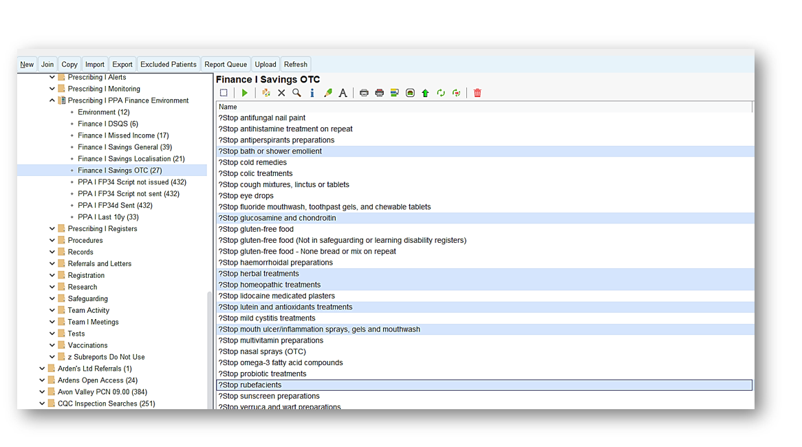 Within the Prescribing | PPA Finance Environment folder there are reports which can help you to identify patients who may be being prescribed medications that are not appropriate or only appropriate in exceptional circumstances. These patients can then be reviewed: