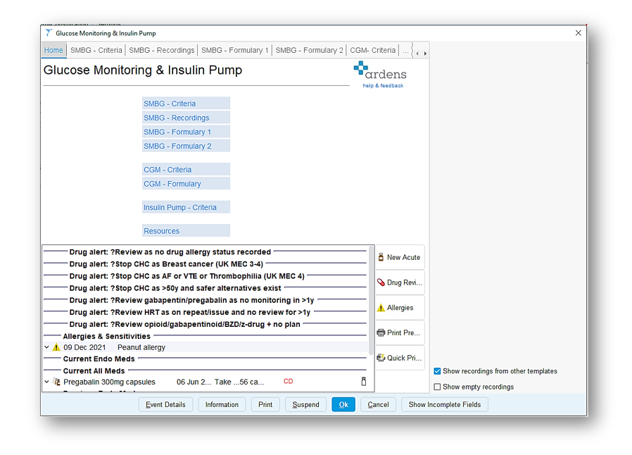 The Glucose Monitoring template guides you to select whether the patient is eligible for SMBG or CGM. The formulary has been developed using the Commissioning recommendations following the national assessment of blood glucose and ketone meters, testing strips and lancets, NHS England:
