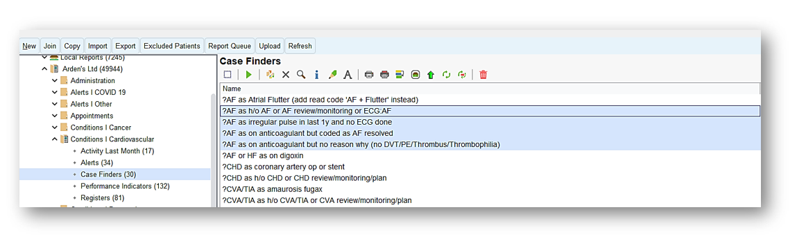 There are also reports to help identify patients that should be prescribed an anticoagulant or have AF coded, these can be found in Conditions | Cardiovascular | Alerts and Conditions | Cardiovascular | Case Finder sections:
