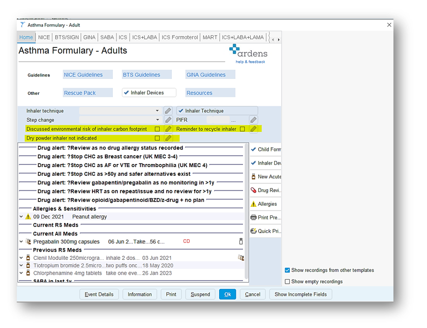 The Asthma and COPD templates have tick boxes reminding you to offer patients a DPI rather than an MDI, to discuss the environmental impact of inhalers and to recycle their inhaler.