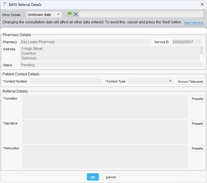 You can then press 'Search' under the patients postcode in this screen to search for local pharmacies and choose the most appropriate one. You can then fill in the referral form. For more information on the BARS Referral process, contact TPP.