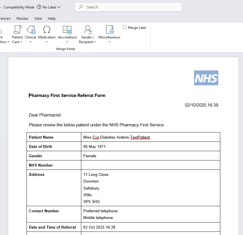 The final way is by clicking on the ‘Letter’ button, this will launch a word document, pre-populated with the patient’s demographic information.