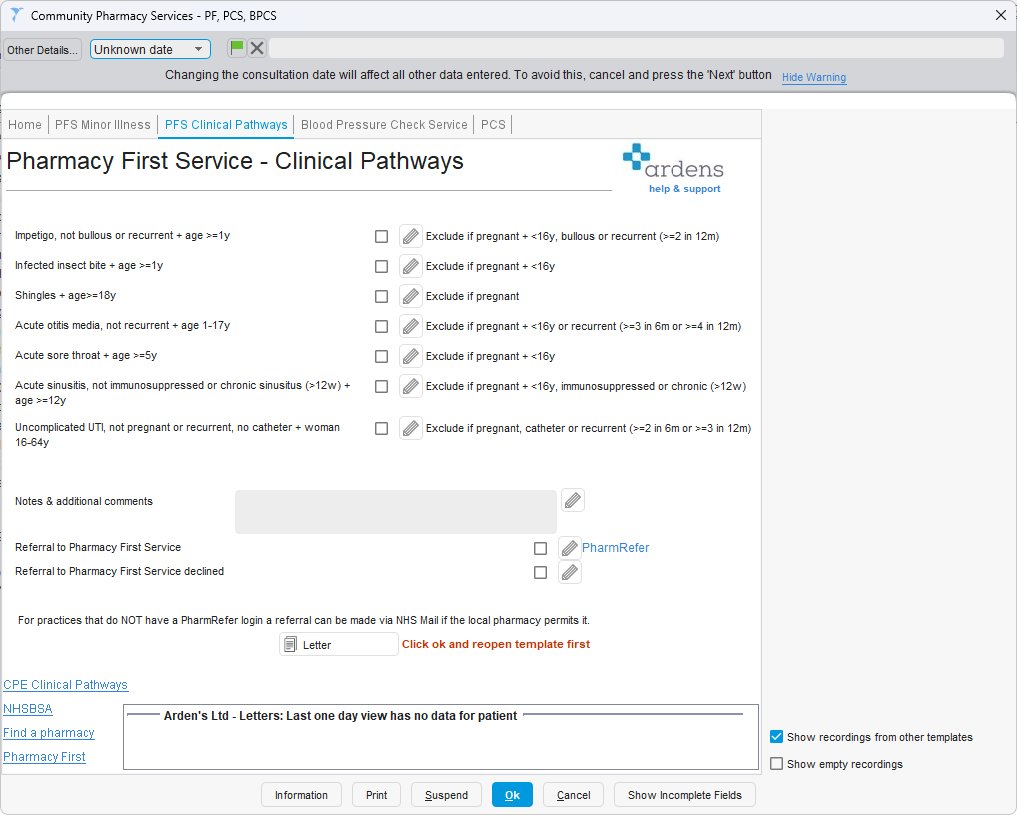Please Note: As stated on the template; click OK at the bottom of the template and then reopen the Pharmacy First template before completing the 'Letter'. |