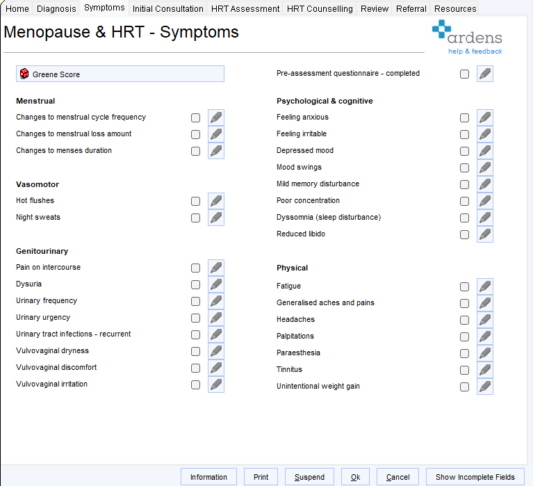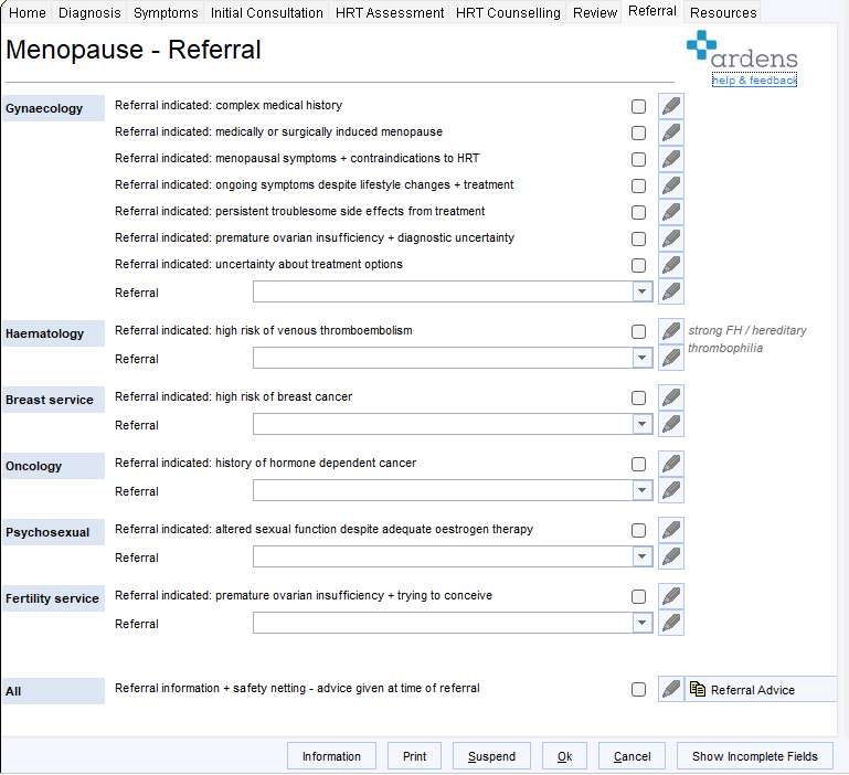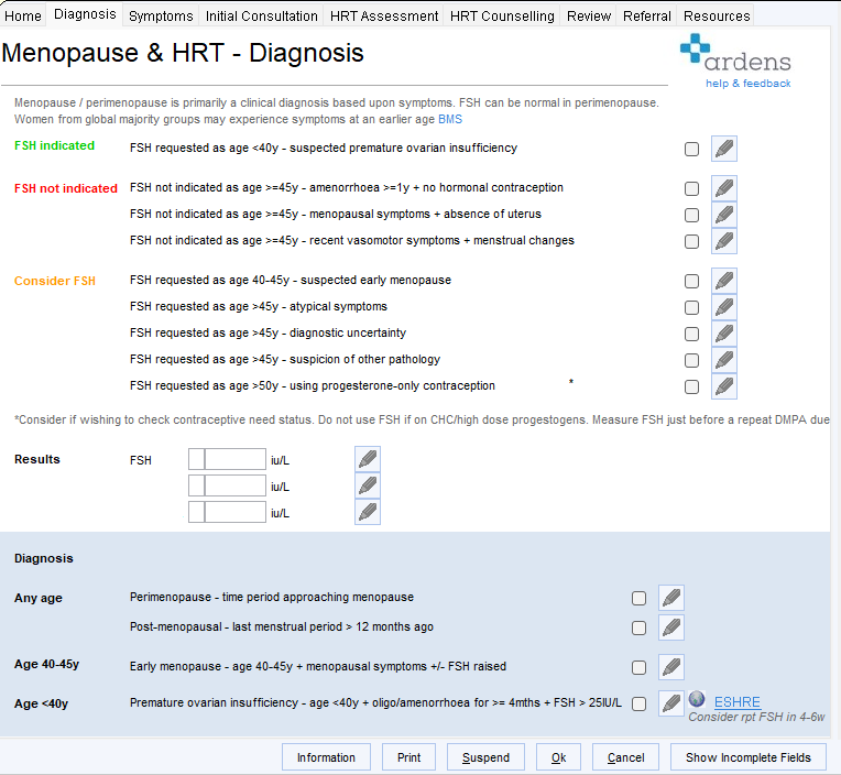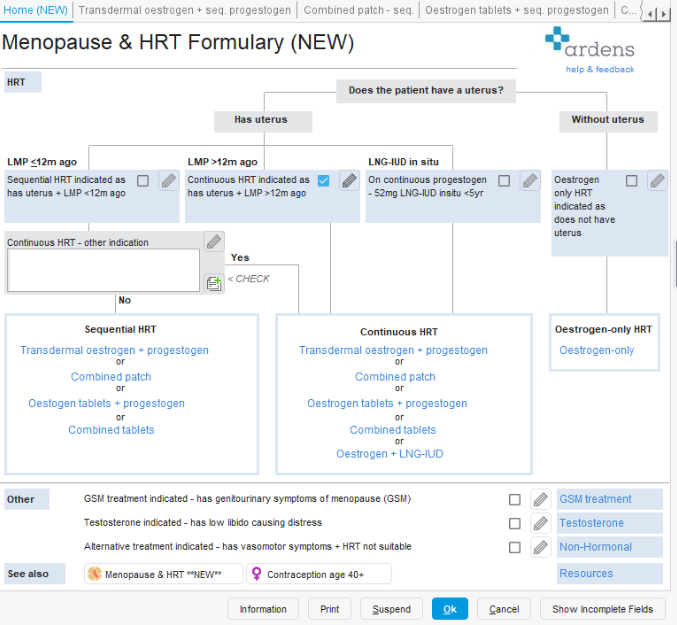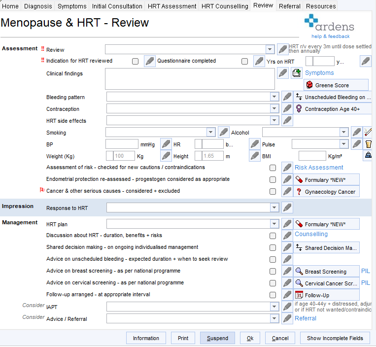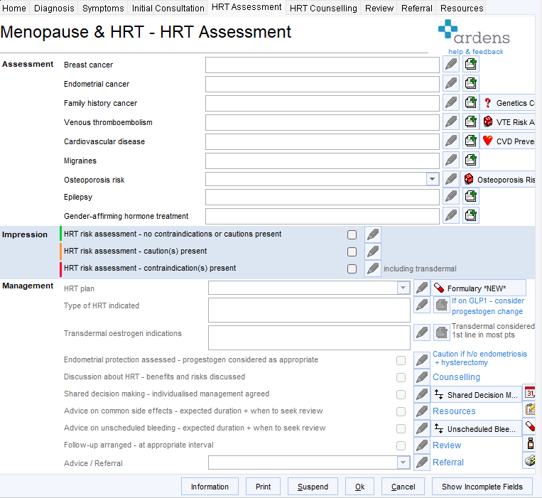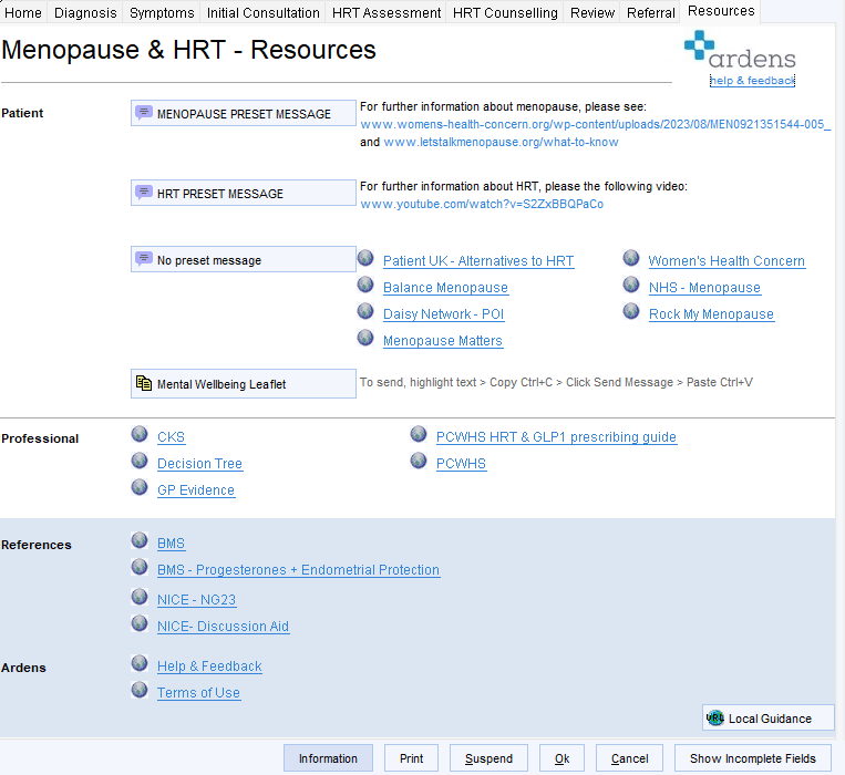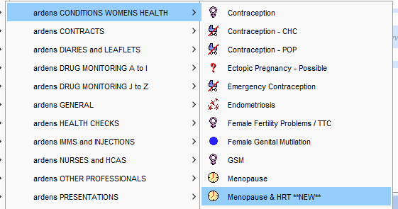 Ardens provides structured menopause and HRT resources embedded within the clinical system to support consistent, high-quality care across the full patient pathway. The resources include: